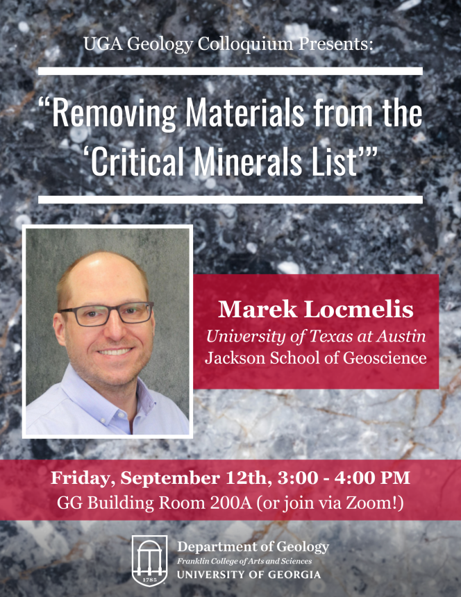 Friday, September 12 2025, 3 - 4pm GG Building 200A or via Zoom Colloquium Speaker: Marek Locmelis Title: Removing Materials from the ‘Critical Minerals List’ Hosted by: Dr. Pistone Abstract: Critical minerals play a key role in modern technologies and the global transition to a low-carbon economy. Although critical mineral demand has exponentially grown over the past decade, a decline in discoveries of new critical mineral deposits poses a significant threat to global economic growth. Critical mineral recycling, recovery as co-products from existing production streams, and extraction from unconventional resources can mitigate some supply chain issues. However, new discoveries need to be made to account for future increased demand. This presentation will discuss novel approaches to conceptual and empirical exploration targeting to guide the discovery of new resources. This is a hybrid event, if you are unable to join us in person please join via zoom. Meeting ID: 997 2477 2096 Note: A password is required to join this meeting. Please call the Geology office (706-542-2652) and speak with a representative to obtain the code. Alternatively, a code request can be made to UGA Geology. Marek Locmelis Jackson School of Geoscience University of Texas at Austin