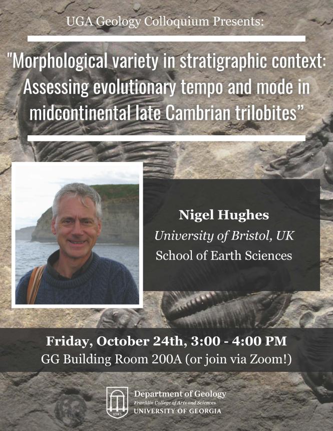 Friday, October 24 2025, 3 - 4pm GG Building 200A or via Zoom Colloquium Speaker: Nigel Hughes Title: Morphological variety in stratigraphic context: Assessing evolutionary tempo and mode in midcontinental late Cambrian trilobites Hosted by: Dr. Holland Bio: In the 1940’s George Gaylord Simpson opined that the principal contribution of paleontology to evolutionary biology lies in the assessment of evolutionary tempo and mode. Since that time the importance of understanding the accumulation history of the stratigraphic record in making such assessments has received wide recognition. Dikelocephalid trilobites from late Cambrian shelfal facies are a “good” group of fossils with a “good” record of their occurrence, meaning that membership of the group can be defined with reasonable confidence, and that it is moderately well represented in terms of sample sizes, at least for rocks of Cambrian age. Given this situation, what can be said about the tempo and mode of their evolution over timescales beyond the scope of studies of living organisms, and may we dissect patterns that speak of biological processes from those that were geologically driven? Our group’s work on this group of fossils, on-going for almost 40 years, suggests examples of patterns of morphological variation driven by stratigraphic controls, but also reveals patterns consistent with both Darwin’s expectations of evolution within/among populous species, and with rapid turnover and accelerated rates of morphological change, with a possible example of evolution in punctuated mode. Uncertainties of various kinds remain. Nigel Hughes received his PhD from the University of Bristol, UK, in 1990 and has enjoyed positions in museums and universities in Ireland, Australia and the USA. His research has focused mainly on the precollisional geology of the northern Indian margin and its implications of models of Himalayan uplift and erosion, and on the evolution of developmental regulation in trilobites. This is a hybrid event, if you are unable to join us in person please join via zoom. Meeting ID: 997 2477 2096 Note: A password is required to join this meeting. Please call the Geology office (706-542-2652) and speak with a representative to obtain the code. Alternatively, a code request can be made to UGA Geology. Nigel Hughes UC Riverside