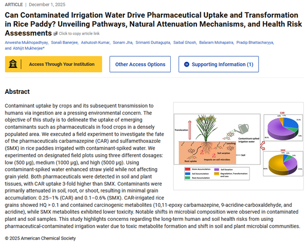 Image: ACS ES&T Water - "Can Contaminated Irrigation Water Drive Pharmaceutical Uptake and Transformation in Rice Paddy? Unveiling Pathways, Natural Attenuation Mechanisms, and Health Risk Assessments." New publication from a recent collaboration in ACS ES&T Water. The paper looks at a key question: can contaminated irrigation water drive pharmaceutical uptake and transformation in rice paddy? We conducted a field experiment to study what happens to the pharmaceutical compounds in a paddy field. This paper is one of the first studies to show that pharmaceuticals in irrigation water cannot only enter plants but also change into new compounds inside the plant, raising serious concerns about food and environmental safety. Authors: Anwesha Mukhopadhyaya, Sonali Banerjeeb, Ashutosh Kumarc, Sonam Jhab, Srimanti Duttaguptad,e, Saibal Ghoshb,f, Balaram Mohapatrac, Pradip Bhattacharyyab, Abhijit Mukherjeea,g a-School of Environmental Science and Engineering, Indian Institute of Technology Kharagpur, Kharagpur 721302, West Bengal, India b-Agricultural and Ecological Research Unit, Indian Statistical Institute, Giridih, Jharkhand 815301, India c-Environmental Biotechnology Division, Gujarat Biotechnology University, Gandhinagar, 382355, Gujarat, India d-Department of Geology, University of Georgia, Athens, GA 30602, USA e-Graduate School of Public Health, San Diego State University, San Diego, CA, 92182, USA f-Department of Analytical Services, Tocklai Tea Research Institute, Tea Research Association, Jorhat, 785008, Assam, India g-Department of Geology and Geophysics, Indian Institute of Technology Kharagpur, Kharagpur 721302, West Bengal, India Abstract: Contaminant uptake by crops and its subsequent transmission to humans via ingestion are a pressing environmental concern. The objective of this study is to delineate the uptake of emerging contaminants such as pharmaceuticals in food crops in a densely populated area. We executed a field experiment to investigate the fate of the pharmaceuticals carbamazepine (CAR) and sulfamethoxazole (SMX) in rice paddies irrigated with contaminant-spiked water. We experimented on designated field plots using three different dosages: low (500 μg), medium (1000 μg), and high (5000 μg). Using contaminant-spiked water enhanced straw yield while not affecting grain yield. Both pharmaceuticals were detected in soil and plant tissues, with CAR uptake 3-fold higher than SMX. Contaminants were primarily attenuated in soil, root, or shoot, resulting in minimal grain accumulation: 0.25–1% (CAR) and 0.1–0.6% (SMX). CAR-irrigated rice grains showed HQ > 0.1 and contained carcinogenic metabolites (10,11-epoxy carbamazepine, 9-acridine-carboxaldehyde, and acridine), while SMX metabolites exhibited lower toxicity. Notable shifts in microbial composition were observed in contaminated plant and soil samples. This study highlights concerns regarding the long-term human and soil health risks from using pharmaceutical-contaminated irrigation water due to toxic metabolite formation and shift in soil and plant microbial communities. Type of News/Audience: Department News Tags: Pharmaceuticlals Research Areas: Geomicrobiology Read More: ACS Publications